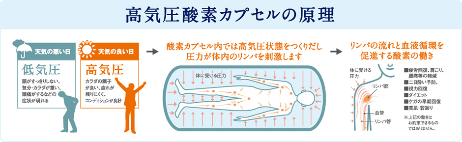 カプセル内を高気圧環境にする事によって、溶解型酸素を増やし身体の隅々まで酸素を供給し、細胞を活性化するのが高気圧酸素です。